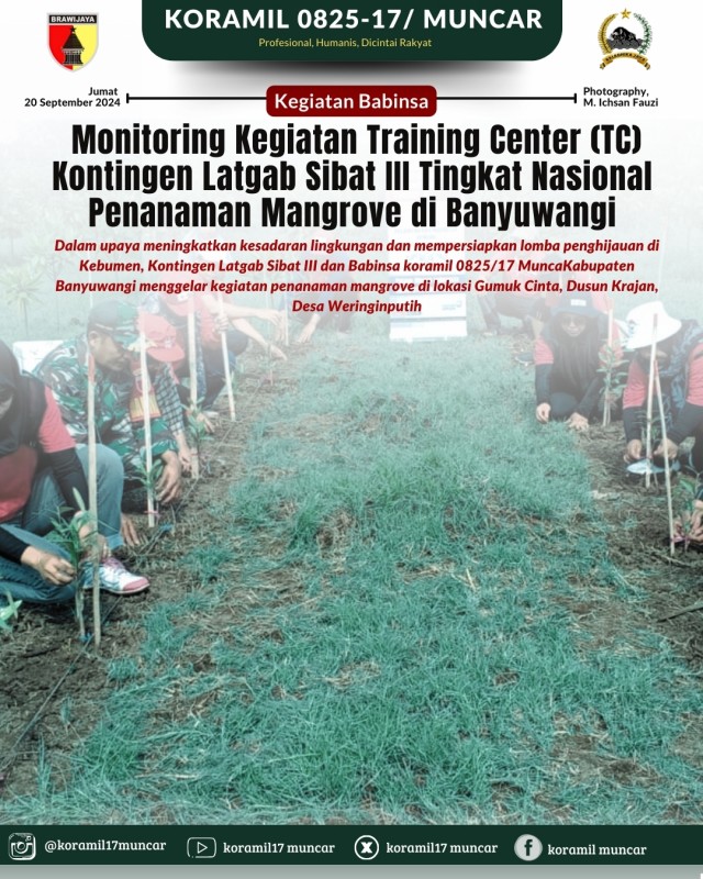 Banyuwanginews - Jum'at, 20 September 2024, telah dilaksanakan kegiatan penanaman mangrove oleh Kontingen Latgab Sibat III Kabupaten Banyuwangi di lokasi Gumuk Cinta, Dusun Krajan, Desa Wringinputih, Kecamatan Muncar.